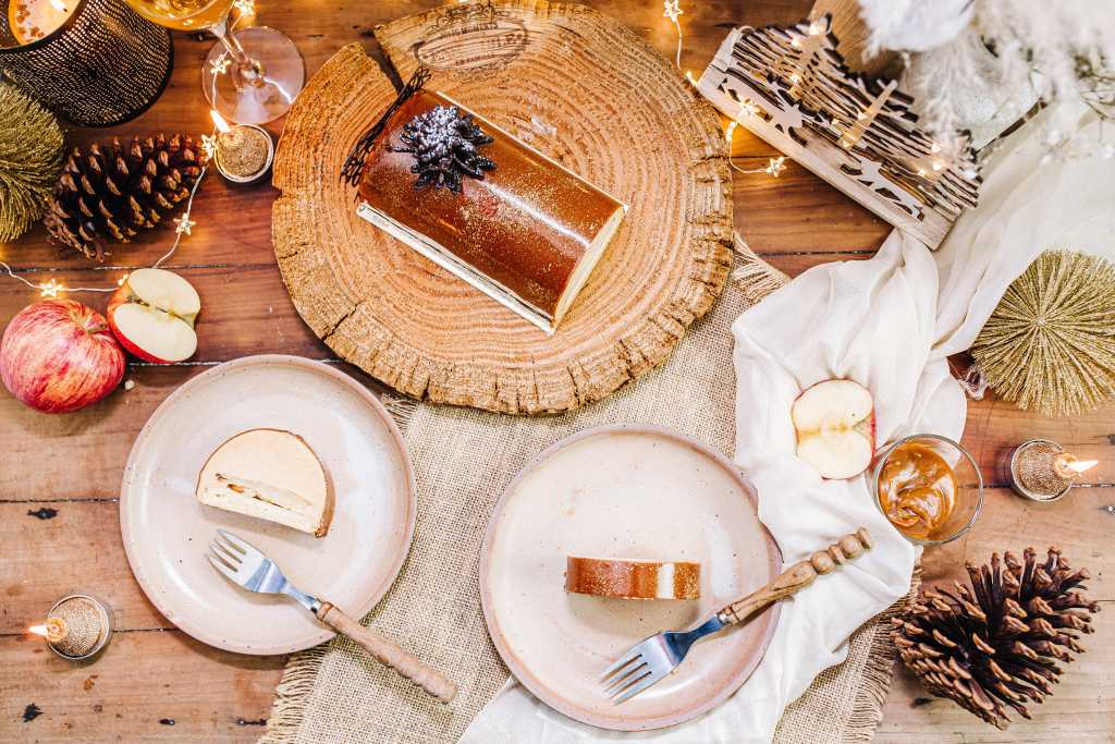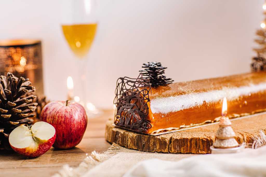 La bûche Karaboudjan est composée d'un biscuit financier, de pommes cuites au cidre et d'une mousse au caramel au beurre salé. Elle est nappée d'un glaçage miroir au caramel.