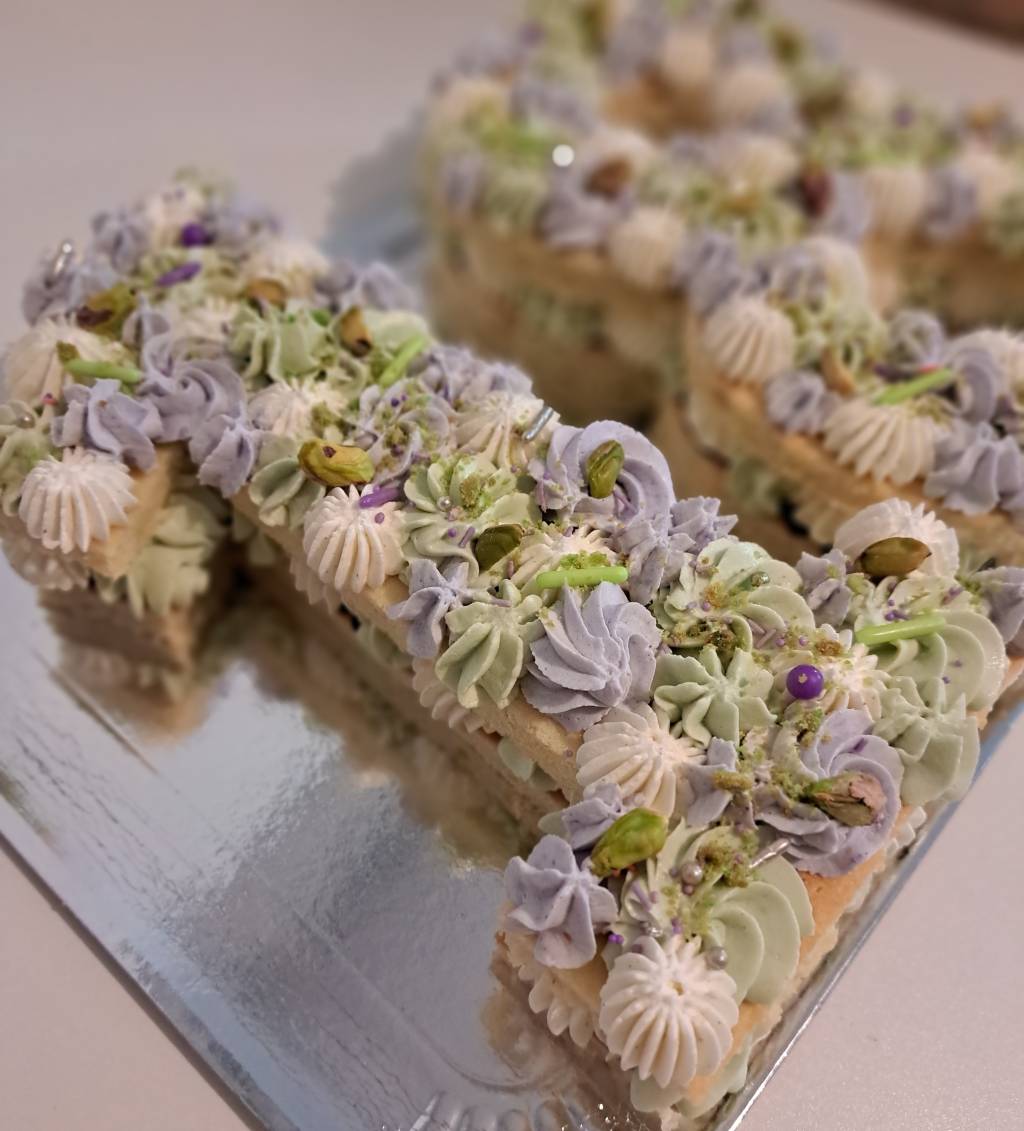 Biscuit moelleux à l'amande, crème légère vanille, crème légère pistache et confiture de cassisDeux format disponibles :